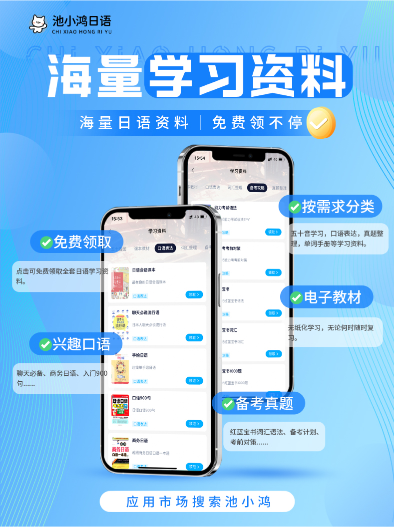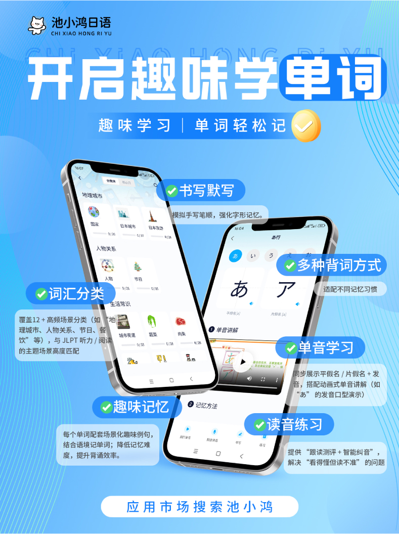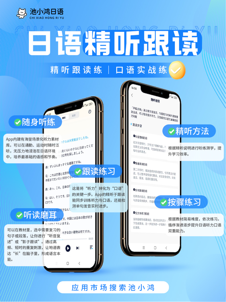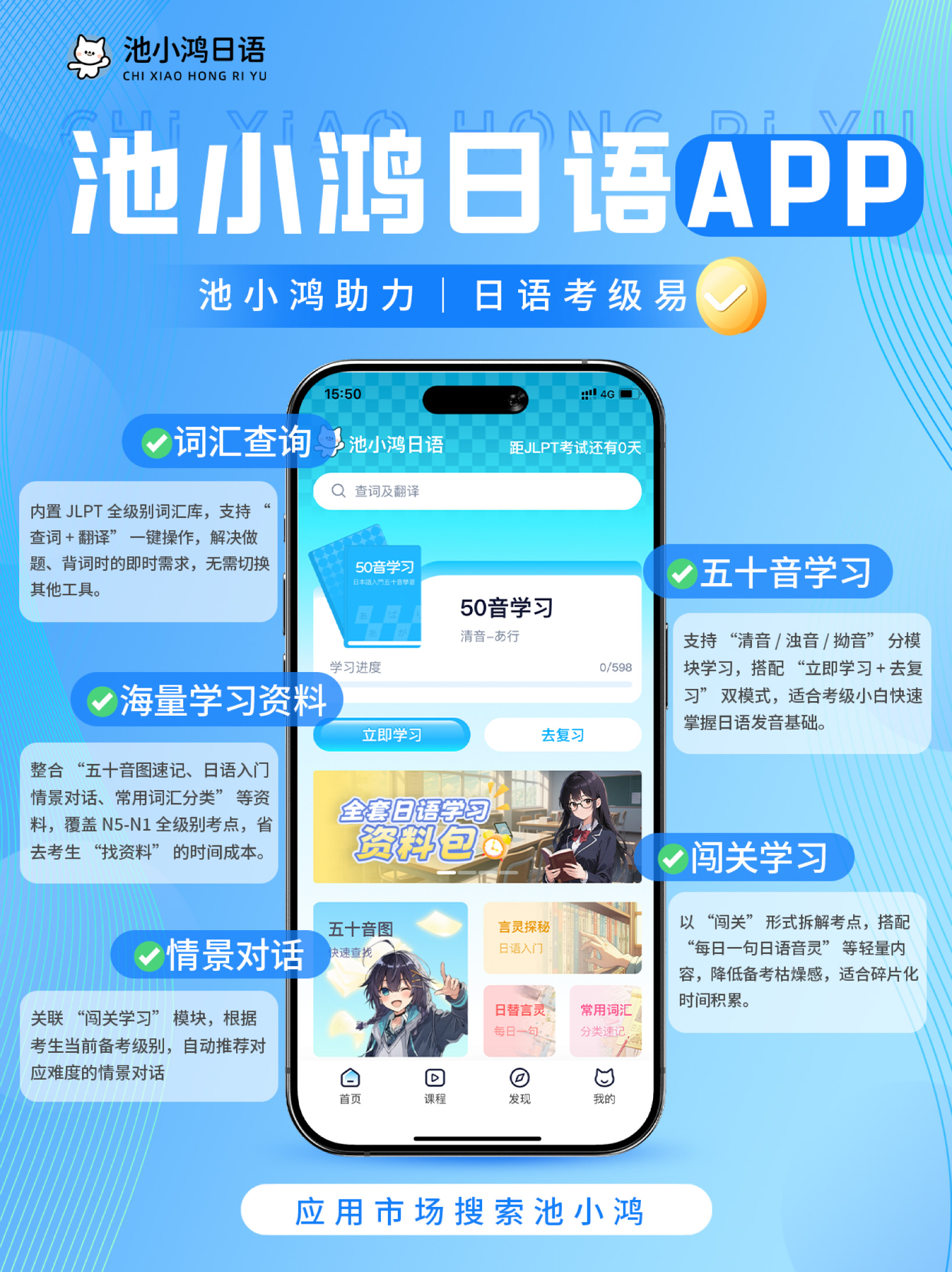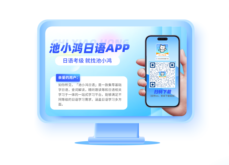 池小鸿日语 APP,覆盖 0-N1 全阶段日语学习!中外双师教学,海量精选课程 + 免费资料随心领,精听跟读、磨耳纠音功能齐全。搭配一对一辅导、三对一督学与阶段测试,定制专属学习规划,专治拖延症,助力轻松攻克 JLPT 考级!当科技深度融入教育,学习便不再局限于固定的时间和空间。池小鸿日语App,正是我们将多年教学精髓凝练成的「移动学习中枢」,它不止是一个工具,更是一位懂教学、有温度、能伴随的智能学伴。