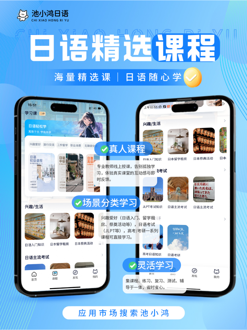 池小鸿日语 APP,覆盖 0-N1 全阶段日语学习!中外双师教学,海量精选课程 + 免费资料随心领,精听跟读、磨耳纠音功能齐全。搭配一对一辅导、三对一督学与阶段测试,定制专属学习规划,专治拖延症,助力轻松攻克 JLPT 考级!当科技深度融入教育,学习便不再局限于固定的时间和空间。池小鸿日语App,正是我们将多年教学精髓凝练成的「移动学习中枢」,它不止是一个工具,更是一位懂教学、有温度、能伴随的智能学伴。